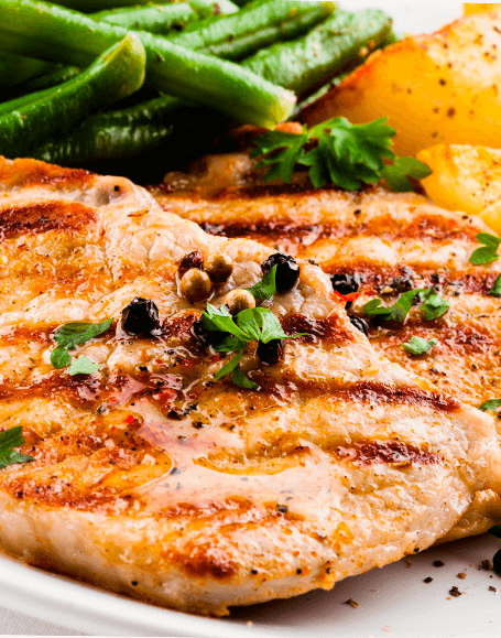medallones de lomo de cerdo de 230 a250 gramos cada uno 4 cucharadas de aceite vegetal 2 Sal al gusto taza de vino de manzana 1 manzanas verdes peladas, descorazonadas y cortadas en cubos de 3x3 centímetros 2 Piña descorazonada y cortada en cubos de 3x3 centímetros 1/4 taza de pistachos 1/4 cebolla cabezona cortada en julianas finas 1 taza de champiñones tajados 1 taza de caldo de pollo 1 taza de recortes de frutas (manzana y piña) 1 cucharas de azúcar morena 2 cucharas de aceite vegetal 2
